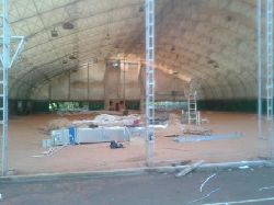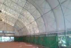 Размеры сооружения 35,00 м на 45,40 м. Высота в коньке 11,5м. Общая площадь - 1589 м.кв. Металический каркас представляет собой сборно-разборную жесткую конструкцию. Тентовое покрытие изготовлено из прочной армированной ПВХ ткани бельгийского производства. Консирукция пригодна для круглогодичного использования в диапазоне температур от -40 до +70 с учетом снежных и ветряных нагрузок в соответствии с регионом использования.
